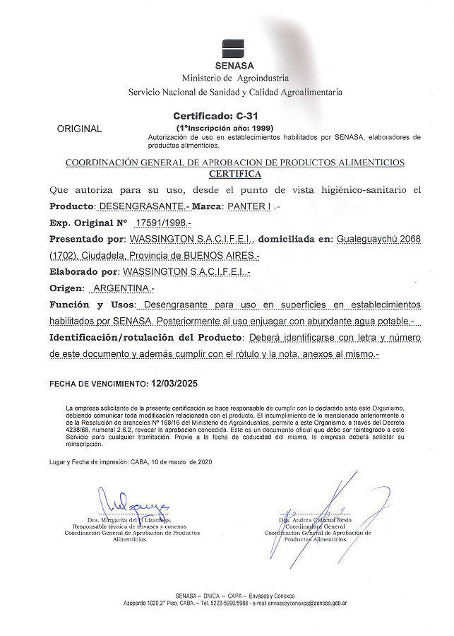 PANTER I es un fuerte desengrasante alcalino capaz de remover las suciedades más rebeldes, especialmente las derivadas de grasas y aceites. Su alto poder de emulsión y dispersión deja las supercies totalmente limpias y desengrasadas, en pocos minutos y sin esfuerzo.
